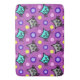Um tapete de banho de grande dimensão, com um padrão de design de cinzas e gatos lacrimogêneos, bonito e colorido, contra um fundo violeta roxo, com sotaques de bolinhas multicolores.