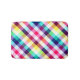 Um tapete de banho de pequeno porte com um padrão colorido de xadrez design em cores arco-íris.