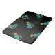 Este produto apresenta um belo padrão floral sobre fundo negro com folhagem verde e flores atraentes em turquesa, e coral.