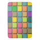 Formas quadradas vivas e sortidas, redondas e brilhantes, dispostas segundo um padrão geométrico simétrico, apresentando tons vibrantes contrastantes numa composição artística e moderna.