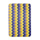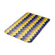 Um tapete de banho de tamanho médio, com um design de chevrons giro e maciço em azul, amarelo e ouro.