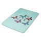 Um tapete de banho desenhado com borboletas elegantes e fluviais em muitas cores brilhantes, como verde, laranja, azul, vermelho e rosa. Desenhos de temas florais adicionam um toque caprichoso.