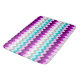 A large size bath mat featuring a beautiful, colorful pattern design of chevrons in plum purple ombre, lilac, white, minty teal, turquoise, and gray.