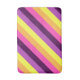 Um tapete de banho de tamanho médio com um design de padrão bonito e colorido de faixas diagonais em roxo de ameixa, lavanda, amarelo-limão, laranja de melão e magenta brilhante.