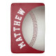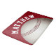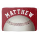 Um tapete de banho vermelho com um design de impressão de baseball e um nome personalizável curvo branco impresso à sua volta. Conjuntos de banho e acessórios disponíveis no Departamento de Casa/Banheiro da Charming Man Store.
