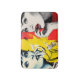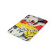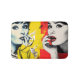Duas mulheres são representadas num estilo vibrante e pop, uma em tons de azul e amarelo e a outra em tons de cinza com batom vermelho ousado. O plano de fundo apresenta uma mistura de padrões abstrato em tons vermelhos e amarelos.