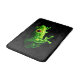 Um sapo verde fractalized com os olhos alaranjados impetuosos contra um fundo preto.