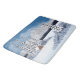 Um tapete de banho com uma bela cena de inverno, incluindo montanhas de neve, cabana rústica e neve coberta por vergreens. Arte original por W.B.