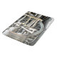 A photographic design of the wheel from a steam train.