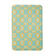 Stylized geometric pattern with bold orange hexagons and white details against a teal background, forming a repeating, symmetrical design.