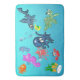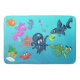Bath Mat com criaturas agudas do mar, incluindo polvo e lula, tubarão, peixe, cavalos do mar, tartaruga marinha e caranguejo. Ilustrações ©2019 Michael C. Paul