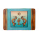 Ele apresenta um dois Kokopelli sudoeste tocando flauta e dançando em volta de um cacto sob o sol em um fundo de turquesa... cercado por uma borda de cobre!