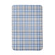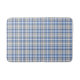Este tapete de banho apresenta um padrão colorido de tartã (xadrez) em cinzas brancas, azuis e acastanhadas (esticadas).