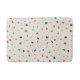 Modelado no azulejo terrazzo italiano, este tapete de banho tem uma aparência divertida e festiva de flocos de confete, em tons de terra quente, com uma abertura de cor. Este tapete de banheiro tem um aspecto limpo e moderno com pisos de azulejo falsos em cinzas, cor de laranja, amarelo, verde-cinza, verde-menta e preto contra um fundo colorido de creme.