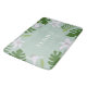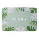 This bath mat features a light green background with a border of lush green tropical leaves and elegant white lily-like flowers. The word "ALOHA" is prominently displayed in white letters in the center, evoking a welcoming, Hawaiian-inspired vibe.