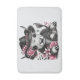 Uma linda vaca preta e branca Highland, decorada com um chapéu preto na moda, adornada com flores cor-de-rosa, apresentando charme e design artístico.