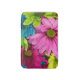 Flores vibrantes, coloridas, margaridas em cores de magenta, rosa, azul e verde limão.