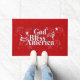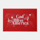 Deus Abençoe a América adorna este tapete de porta patriótico com estrelas brancas em um fundo vermelho brilhante.