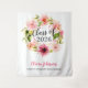 O design do fundo de festa de graduação apresenta um design de coroa de flores da turma de 2026 com belas folhagens pintadas em aquarela verde e flores de dália e rosa primaveris rosa pastel, rosa velho e pêssego. O texto suave preto e rosa brilhante pode ser personalizado com o nome e a escola do graduado. Um fundo perfeito para fotos de festa de graduação!