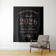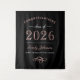 O letreiro de fundo de foto personalizado para festa de graduação "Parabéns" apresenta uma paleta de cores clássica preta, branca e rosa / rosa dourado. Personalize com o nome do graduado e da escola. As cores podem ser personalizadas para combinar com outras cores da festa ou da escola.