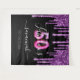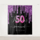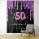 Uma tapeçaria de festa de aniversário 50 & Fabuloso elegante e glamorosa. Um fundo preto clássico decorado com respingos de purpurina falsa roxo escura, com visual de tinta pingando. Com o texto: 50 Fabuloso. Personalize e adicione um nome e uma data. Data de nascimento ou data da festa. O nome é escrito com uma fonte script moderna e manuscrita. Texto em branco. Idade: 50 com uma fonte estilo balão moderna.