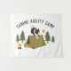 Belas tapeçarias de agilidade de cão com o Border Collie saltando sobre uma tenda com seu amigo dentro. O texto do Campo de Agilidade Canino pode ser personalizado.