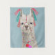 Adorou Llama II por Victoria Borges. Apresenta uma lama esbranquiçada com pompas decorativas e ornamentos semelhantes a tassel.