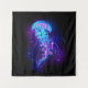 Água-viva grande, azul, desenhada artisticamente, brilhante, brilhante, com longos tentáculos sobre fundo preto com bioluminescência roxa. Água-viva luminosa.