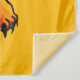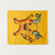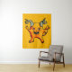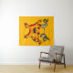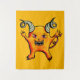 Uma tapeçaria bonita para crianças de demônios com um desenho animado divertido de uma criatura de demônio amarelada estranha com chifres sorrindo alegremente e mostrando seus dentes afiados sobre fundo amarelo quente, excelente para crianças.