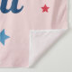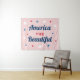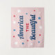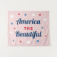 O design da tapeçaria de fundo para fotos de festa de feriado patriótico elegante do dia 4 de Julho apresenta um design de tipografia de citação "America the Beautiful" em cores vermelho, branco, azul e azul-marinho com destaques de estrelas e cor de fundo rosa claro.