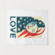 Esta design mostra a figura de uma mulher muçulmana vestindo um hijab de bandeira americana.