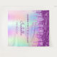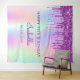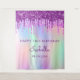 Uma tapeçaria para uma festa de aniversário de 10 anos (ou qualquer idade) feminina e glamorosa. Um fundo holográfico colorido de unicórnio e arco-íris com gotas de purpurina falsa roxa e rosa. Personalize e adicione um nome, idade 10 e uma data. O texto: O nome é escrito em roxo com uma fonte manuscrita moderna. Pode ser usado como banner de boas-vindas, decoração de parede para a festa ou como fundo para cabine de fotos.