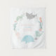 Este tapete de aniversário temático de animais marinhos apresenta uma baleia, tubarão tigre, medusa, tartaruga marinha e cavalo-marinho todos