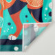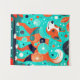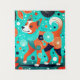 Na peça digital intitulada "Aqua-Orange Canine", um personagem de cão abstrato contra um fundo aqua cheio de círculos e elementos decorativos intrincados numa mistura congruente de tons pretos, aqua e laranja. O canino laranja é representado em estilo minimalista, caracterizado por padrões giratórios que o envolvem, e irradiando uma sensação de frio e calor.