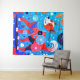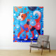 Na peça digital intitulada "Aqua-Orange Canine", um personagem de cão abstrato contra um fundo aqua cheio de círculos e elementos decorativos intrincados numa mistura congruente de tons pretos, aqua e laranja. O canino laranja é representado em estilo minimalista, caracterizado por padrões giratórios que o envolvem, e irradiando uma sensação de frio e calor.