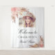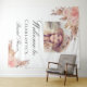 Uma tapeçaria de boas-vindas para um chá de panela de noiva elegante e moderno. Fundo branco, decorado com grama de pampas em estilo boho e flores cor-de-rosa claro e dourado-rosado. Personalize e adicione uma foto dentro da moldura do arco, nome.