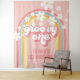 Groovy Um! Estandarte de 1º aniversário com inspiração retrô com fontes e cores dos anos 70, arco-íris e margaridas em rosa