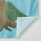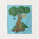 "Árvore da vida" em verde, marrom, roxo e ouro sobre fundo azul.
