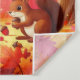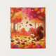 Uma vibrante design de tapeçaria apresentando um esquilo no meio de uma colorida floresta de outono, com folhas caindo e bolotas espalhadas, evocando a aconchegante essência do outono.