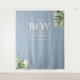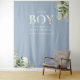 É um menino cenário de fotobooth de chuvadeiro de bebê com tipografia elegante e folhagem botânica bonita em um fundo azul empoeirado. Projetado por Thisisnotme©