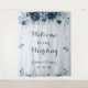Um sinal de bem-vindo ao nosso casamento em tapeçaria de aguarela floral azul marinho e azul empoeirado, dando as boas-vindas aos seus convidados para o casamento em um fundo azul-marinho com caligrafia branca e data numérica.