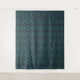 Um padrão intrincado de formas geométricas repetidas cria um design simétrico mesmerizante. Sombras azuis, verdes e pontas de uma mistura amarela harmoniosamente na superfície, formando uma estrutura complexa.