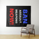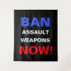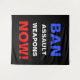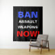 Ban Assault Weapons Now! Pro gun control political activism wall art tapestry with bold blue, white and red text on a black background.