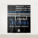 Este design apresenta uma bandeira da polícia com listras pretas e brancas, e uma fina faixa azul de linha também. O texto "A Legenda está se aposentando" fica acima do nome personalizável do polícia oficial aposentado, xerife, capitão ou chefe. Celebre este marco em estilo!