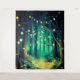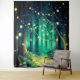A beautiful evening for a wedding, with a forest path adorned with fairy lights in the trees creating a stunning backdrop. A gentle mist lingers in the background of the forest, with countless trees and lights hanging gracefully from their branches.