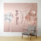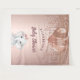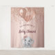 Para um Baby Shower elegante. Um fundo falso metálico rosa dourado. Decorado com pingentes de brilho rosa dourado, efeito de tinta pingando, brilho, serpentinas de festa, balões e uma adorável bebê menina elefante. Personalize e adicione o nome e uma data. Pode ser usado como um banner de boas-vindas, decoração de parede para o baby shower ou como um fundo para fotos.