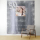 Uma tapeçaria de boas-vindas para uma festa de 50 anos glamourosa. Um fundo metálico prateado falso decorado com pó de glitter falso. Personalize e adicione uma foto de alta qualidade, nome e data. O número 50 é escrito com uma fonte estilo balão.