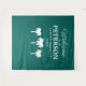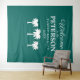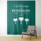 Bem-vindo ao fundo para fotos da festa de reunião familiar. Modelo de tipografia elegante para sobrenome e data. Cores de fundo azul-turquesa ou personalizadas. Ótimo para fazer fotos profissionais de grupo e selfies. Tapeçaria de decoração de parede personalizada disponível em tamanhos pequenos e grandes extra grandes. Decoração personalizada para reunião familiar divertida, encontro, celebração, etc. Silhuetas de palmeiras tropicais com tipografia elegante. Faça o upload do seu logotipo ou brasão chique opcionalmente.