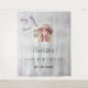 Uma tapeçaria de boas-vindas para uma festa de aniversário de 21 anos feminina e glamorosa. Um fundo metálico prateado falso decorado com purpurina roxa e prateada falsa. Personalize e adicione uma foto de alta qualidade, nome e data. O número 21 é escrito com uma fonte estilo balão.