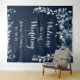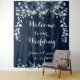 Uma placa de tapeçaria de boas-vindas ao nosso casamento em aguarela floral azul e empoeirada, dando as boas-vindas aos seus convidados para o casamento em um fundo azul-marinho com data numérica e caligrafia branca.